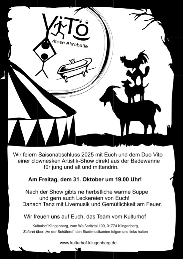 Saisonabschluss im Zelt mit Duo Vito und seiner clownesken Artistik-Show direkt aus der Badewanne. Wichtige weitere Informationen auf dem Flyer.